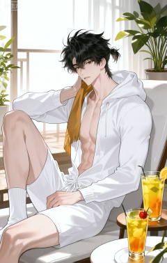 xiaozhitiao,dianmei,1boy,bangs ,socks,white socks,dianmei (artist:mazjojo:0.53),(artist:pigeon666:0.37),(artist:zawar379:0.57),(artist:remsrar:0.35),(artist:yoneyama mai:0.64),(yokoyari mengo:0.6),1boy,male focus,solo,medium - length wavy hair,hooded pajamas,hood down, a light - brown knitted scarf draped over his shoulders, his toned abs visible as he dozes off in a hammock on a wooden patio. The hammock is strung between two posts, and there's a small side table with a half - read book and a glass of lemonade. Potted ferns line the edges of the patio, and the afternoon sun casts a warm, yellow glow.,White bodysuit