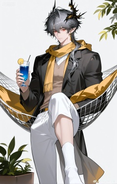 xiaozhitiao,dianmei,1boy,bangs ,socks,white socks,dianmei (artist:mazjojo:0.53),(artist:pigeon666:0.37),(artist:zawar379:0.57),(artist:remsrar:0.35),(artist:yoneyama mai:0.64),(yokoyari mengo:0.6),1boy,male focus,solo,medium - length wavy hair,hooded pajamas,hood down, a light - brown knitted scarf draped over his shoulders, his toned abs visible as he dozes off in a hammock on a wooden patio. The hammock is strung between two posts, and there's a small side table with a half - read book and a glass of lemonade. Potted ferns line the edges of the patio, and the afternoon sun casts a warm, yellow glow.,White bodysuit