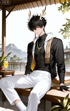 JianXingZhu \(Return of the Dragon Tide\)solo, short hair, shirt, black hair, red eyes, gloves, long sleeves, 1boy, jewelry, sitting, closed mouth, jacket, tail, white shirt, male focus, earrings, outdoors, horns, black gloves, pants, fingerless gloves, necklace, open jacket, tree, feet out of frame, leaf, tassel, dragon horns, beads, mountain, white pants, dragon tail, branch, antlers, bishounen, tassel earrings