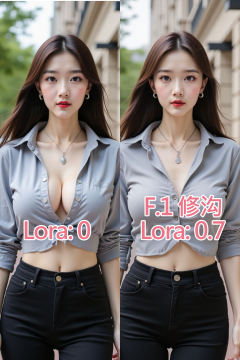 The image is a high-resolution photograph of a young East Asian woman standing on a city street. She has a fair complexion and long, straight, dark brown hair that falls past her shoulders. Her facial features are delicate, with large, expressive eyes, a small nose, and full lips painted with a bold red lipstick. She is wearing a light gray, button-up blouse that is unbuttoned at the top, revealing a hint of her cleavage. The blouse is slightly cropped, exposing her midriff, and has three-quarter sleeves. She pairs this with black pants that fit snugly, showcasing her slim waist and hips. She accessorizes with a delicate silver necklace featuring a small pendant and small hoop earrings. Her outfit is casual yet stylish, emphasizing her slender figure. The background features a city street with a mix of urban elements: a parked car on the left, a sidewalk with red-brick paving, and a building with beige walls and a black railing. The sky is clear, and green trees line the street, adding a touch of nature to the urban setting. The overall mood of the image is modern and chic, capturing a young woman confidently striding through a bustling city. <lora:20251211_TinFlux1ClothesSliderLora_v1A:0.0>