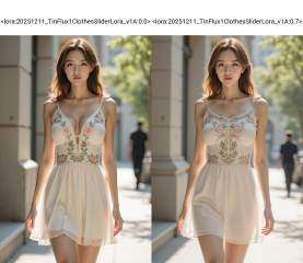 Photorealistic portrayal of a stylish young woman walking down a sunlit urban alley. She wears a white sheer mini dress with delicate floral embroidery, sleeveless with a translucent overlay, ivory tones and pastel pink/green embroidery. She has shoulder-length light brown hair in soft waves, natural makeup, calm expression, gaze toward the camera. Pose: relaxed stride, arms at sides. Background: blurred city alley with concrete walls and hints of greenery; distant figure in dark clothing. Lighting: warm daylight from the side, soft shadows, gentle highlights on fabric. Textures: chiffon/organza-like fabric, lace embroidery, smooth skin. Colors: ivory-white dress, pale pink and sage green embroidery, gray walls, green foliage. Style: cinematic, high-detail photorealism, shallow depth of field, 50mm lens, f/2.0, subtle film grain. <lora:20251211_TinFlux1ClothesSliderLora_v1A:0.0>