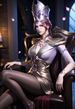 masterpiece,best quality,amazing quality,very aesthetic,high resolution,ultra-detailed,absurdres,scenery,photorealistic,(looking at viewer:1.1),(Dark room:1.3),(moody lighting:1.1),peach blossom,falling petals,(large breasts:0.8),bibidong,1girl,solo,jewelry,gem,armor,brown hair,hat,lips,necklace,brown eyes,earrings,cleavage,crown,long hair,dress,red eyes,makeup,ponytail,short hair,pantyhose,pink hair,purple hair,shoulder armor,long sleeves,high heels BREAK photorealistic details,<lora:QQSillbibidongV1:0.8>,