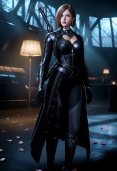 masterpiece,best quality,amazing quality,very aesthetic,high resolution,ultra-detailed,absurdres,scenery,photorealistic,(looking at viewer:1.1),(Dark room:1.3),(moody lighting:1.1),peach blossom,falling petals,(large breasts:0.8),jiangfang,1girl,solo,brown hair,short hair,armor,jewelry,earrings,realistic,grey eyes,cleavage cutout,bodysuit,clothing cutout,red lips,weapon on back,high_heel_boots BREAK photorealistic details,<lora:QQSilljiangfangV1:0.8>,