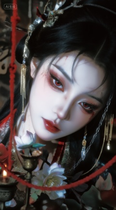 超写实写真摄影,动漫人物cos,强烈的明暗对比,超高清,垂坠感,清冷感,最高画质,丹凤眼,细长的眼尾,绯红眼影,长翘睫毛,细腻清透红润的皮肤有光泽质感,细腻渲染,绝美眼睛,透亮的星光瞳孔,流苏宝石耳饰,邪魅,细节五官,散发温润光泽的闪粉唇釉,真实细腻的肌理感,极致的皮肤细节刻画,充满故事感和肃杀氛围的超古风主义美学画面,以深红,金银,银色和墨绿为主要色彩,插入极度精致繁华的花卉,运用厚涂和晕染水粉技法,营造颗粒感,肌理感及颜料涂抹质感,营造高级氛围感和层次感,背景为模糊深色破旧昏暗阴冷房间场景,叠涂和弥散渐变效果,色彩饱满层次丰富,增加繁复细节神秘元素,梦幻朦胧,焦点模糊,暗朦氛围,冷色调,强烈光影对比,前景模糊红线,诡异风格,模糊雾气繁复垂坠点缀,柔和光线自然色彩过渡,水晶锁链纵横交错发出淡淡的光芒,散发出既神秘又迷人的诡异美感,美人与场景结合,融为一体,, Negative prompt: ng_deepnegative_v1_75t,(badhandv4:1.2),EasyNegative,(worst quality:2),,nsfw, Steps: 30, Sampler: Euler, CFG scale: 4.0, Seed: 3997813155, Size: 1142x2048, Model hash: 9768b098f7, Model: ZOZ_v1.0.safetensors, Denoising strength: 0, RNG: CPU, Lora 1: 行艺摄影-幽冷氛围感摄影, Lora Hash 1: 136eb14259, Lora Weight 1: 0.8, vae_name: automatic