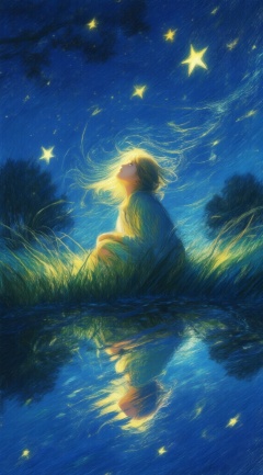 Illustration,Illustration,Fluorescent painting,Emotional illustration,There is a clear pool of water in the grass,with a mirror like surface reflecting the figures of a girl. The girl is sitting in the grass,her long blonde hair swayed in the waves of light,and the sky was a deep blue with shining stars. She looks up at the sky,wears a dress,The moonlight shone on the water,casting a faint silver glow.A peaceful and dreamful atmosphere. Crayon texture,rich colors,full of vitality.,big stars,small stars,big trees,Illustration,ldkl style,Mid shot,shot from below,A shot with tension,, Negative prompt: ng_deepnegative_v1_75t,(badhandv4:1.2),EasyNegative,(worst quality:2),,nsfw, Steps: 30, Sampler: Euler, CFG scale: 4.0, Seed: 610310266, Size: 1142x2048, Model hash: 9768b098f7, Model: ZOZ_千问大模型~超强泛化改良版_v1.0.safetensors, Denoising strength: 0, RNG: CPU, Lora 1: ZOZ, Lora Hash 1: aadbc953ae, Lora Weight 1: 0.8, vae_name: automatic