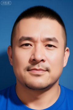 在室内专业人像拍摄场景中,白天时分,柔和的顶光均匀洒落。一位中年男子拍摄正面人像,他留着短而整齐的板寸头,脸颊和下巴上的胡须修剪得干净利落,身着亮蓝色上衣。他头部端正朝前,背景是纯蓝色的墙面,光线清晰地勾勒出面部轮廓,整体画面简洁正式,兼具身份证照片或标准人像的质感。