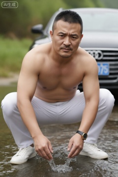 DYWH,A middle-aged man with a tough, masculine face and neat short hair. He is shirtless, with a muscle-covered-by-fat yet tight body, and powerful muscle lines. Wearing white casual pants, white shoes, and a watch with a black dial and golden frame on his left wrist. He squats in the stream, playing with water, with a black Audi parked behind and lush greenery around.
