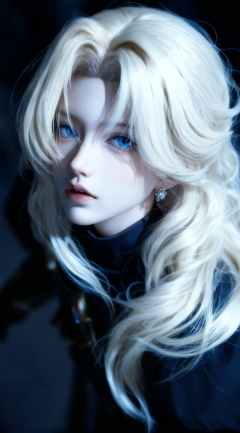 a close-up portrait of a young woman with long, wavy, platinum blonde hair and striking blue eyes, wearing a dark outfit with a high collar and a pair of earrings, she has a serious expression and is looking directly at the viewer, with her lips slightly parted, her hair is styled in loose waves and falls down her back, framing her face, the lighting is soft and diffused, highlighting her features and creating a dramatic effect, the background is dark and blurred, with a focus on her face and upper body, creating a sense of depth and dimension, the image has a high level of detail and realism, making it a beautiful and captivating piece of art,, Negative prompt: ng_deepnegative_v1_75t,(badhandv4:1.2),EasyNegative,(worst quality:2),,nsfw, Steps: 30, Sampler: Euler, CFG scale: 6.0, Seed: 1263750358, Size: 1142x2048, Model hash: 98763a1277, Model: Qwen-Image_1.0.safetensors, Denoising strength: 0, RNG: CPU, Lora 1: ZOZ_湿润特效, Lora Hash 1: 36836624eb, Lora Weight 1: 0.8, vae_name: automatic