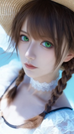 a photo-realistic shoot from a close-up camera angle about a young woman with striking green eyes and brown hair styled in two braids,wearing a straw hat and a white dress with lace details,the image also shows a soft,blurred background with light blue tones,on the middle of the image,a 1woman appears to be looking directly at the viewer with a serious expression,she has a slender physique,fair skin,and green eyes,her hair is styled in a braid that falls over her shoulder,she is wearing a white lace choker around her neck,the background is out of focus,focusing attention on the subject,, Negative prompt: ng_deepnegative_v1_75t,(badhandv4:1.2),EasyNegative,(worst quality:2),,nsfw, Steps: 30, Sampler: Euler, CFG scale: 6.0, Seed: 3547429442, Size: 1142x2048, Model hash: 98763a1277, Model: Qwen-Image_1.0.safetensors, Denoising strength: 0, RNG: CPU, Lora 1: ZOZ_湿润特效, Lora Hash 1: 36836624eb, Lora Weight 1: 0.8, vae_name: automatic