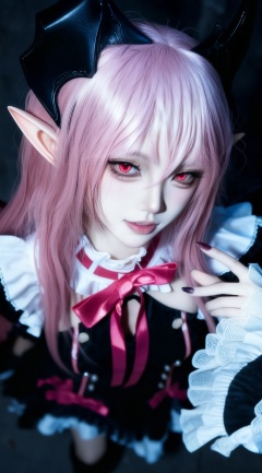a close-up portrait of a young woman with pale skin and long pink hair,wearing a black and white gothic dress with a large red bow,she has pointed ears and a small black horn on her head,giving her a mysterious and alluring appearance,the woman is positioned in the middle of the image,looking directly at the viewer with a serious expression,her red eyes gleaming with a hint of mischief,her lips are slightly parted,and she has a subtle hint of a smile on her lips,her fingernails are painted with a dark nail polish,adding a touch of elegance to her overall look,the background is dark and out of focus,allowing the focus to remain on the womans face and upper body,the overall effect is one of a captivating and mysterious scene,with a focus on the characters delicate features and the intricate details of her outfit,, Negative prompt: ng_deepnegative_v1_75t,(badhandv4:1.2),EasyNegative,(worst quality:2),,nsfw, Steps: 30, Sampler: Euler, CFG scale: 6.0, Seed: 562697600, Size: 1142x2048, Model hash: 98763a1277, Model: Qwen-Image_1.0.safetensors, Denoising strength: 0, RNG: CPU, Lora 1: ZOZ_湿润特效, Lora Hash 1: 36836624eb, Lora Weight 1: 0.8, vae_name: automatic