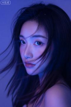 童话般梦幻的女性人像特写,长发随风飘扬,头顶有星星点点的光芒闪烁。眼睛大而圆,像是藏着整个宇宙的秘密。背景是一片虚幻的星空,整体色调偏向冷蓝紫,给人一种既神秘又浪漫的感觉。