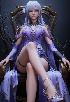(score_9),masterpiece,best quality,absurdres,highres,(white_skin),light_skin,disgust,jitome,BREAKcollarbone,<lora:彩儿-ill:0.83>,caier,1girl,solo,long hair,hair ornament,jewelry,earrings,hair flower,purple eyes,white hair,chinese clothes,shoulder armor,belt,long dress,forearm sleeve,high heels,bare legs,shorts,looking at viewer,front view,sitting,chair,pov,from below,crossed legs,BREAKsimple background,black background,Tyndall effect,fog,branch,twig,<lora:IL反差:-0.5>,<lora:IL饱和:1>,<lora:IL色温:1>,
