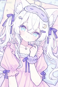 1girl, ahoge, animal ear fluff, animal ears, babydoll, blue eyes, cat ears, cat girl, cat hair ornament, closed mouth, collarbone, crescent, crescent hair ornament, crescent necklace, crossed bangs, dress, dutch angle, frilled babydoll, frilled sleeves, frills, hair ornament, hair ribbon, hairclip, head tilt, jewelry, light blush, logo, long hair, looking at viewer, necklace, nightgown, pajamas, pastel colors, pillow, pink babydoll, pink dress, pink nightgown, puffy short sleeves, puffy sleeves, purple ribbon, purple scrunchie, ribbon, scrunchie, short sleeves, sleep mask, smile, solo, sparkle, sparkling aura, threads username, twintails, twirling hair, upper body, virtual youtuber, white hair, wrist scrunchie