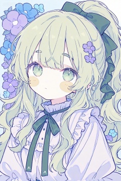 1girl, solo, flower, long hair, looking at viewer, bow, hair bow, closed mouth, ribbon, green hair, green eyes, blush, ponytail, thick eyebrows, frills, frilled shirt collar, shirt, blush stickers, upper body, neck ribbon, purple flower, white background, green bow, blue flower, blue background, frilled collar