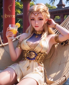 (oriental architecture, elegant decor, sophisticated style:1.1),(Lounging on a hammock, holding a cold drink, and basking in the sun,:1.1),fearfully surprised,(breasts:1.2),<lora:XL16永劫无间席拉:0.95>,miss xila,light yellow high-low dress,blue eyes,circlet,blonde hair,braid,long hair,sash,jewelry,armlet,golden tattoo of holy seal,, score_9,score_8_up,score_7_up,score_6_up,score_5_up,score_4_up,3d rendering,tag1,tag2, Cinematic Lighting,backlighting,