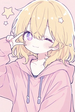 1girl, one eye closed, solo, blonde hair, star \(symbol\), hood, star-shaped pupils, hoodie, v, purple eyes, looking at viewer, smile, upper body, medium hair, symbol-shaped pupils, collarbone, simple background, blush, long sleeves, hood down, closed mouth, pink hoodie, :3, v over eye, pink background, pink nails, hair between eyes, nail polish