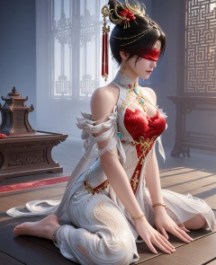 (oriental architecture, elegant decor, sophisticated style:1.1),(Sitting cross-legged on a mat, meditating,:1.1),Sarcastic,(breasts:1.2),<lora:XL16永劫无间宁红叶赤皓新囍白:0.95>,miss ninghongye,white dress with red corset,blindfold,black hair,traditional chinese updo,hair ornament,earrings,jewelry,bare shoulders,, score_9,score_8_up,score_7_up,score_6_up,score_5_up,score_4_up,3d rendering,tag1,tag2, Cinematic Lighting,backlighting,
