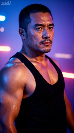 一个中年男人,有一张硬朗、阳刚的脸和整洁的短发。他赤膊上阵,肌肉被脂肪覆盖,但身体紧绷,肌肉线条有力,置身于迷幻的蓝色与紫色霓虹灯光中,他正回眸凝视镜头,眼神充满故事感,他身着带有亮片的黑色吊带背心,脸上的汗滴被风吹起,背景是虚化的都市夜景与闪烁的灯光,摄影,照片级真实,人像模式,焦距85mm,光圈f/1.4,ISO 400,背景光斑如奶油般化开,极致细节,4K壁纸,电影感光影,