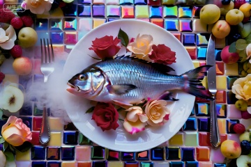 一张马赛克桌子上,摆着洁白的盘子,里面有一条新鲜的鱼,鱼身上开满玫瑰。周围装饰了一圈水果。银色的刀叉。鱼吐出烟雾。超现实主义氛围。