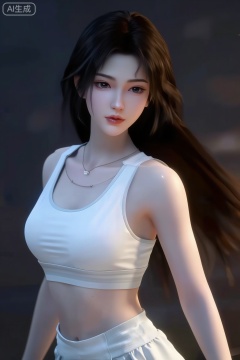 这是一个CGI动画风格,国漫女角色,她的名字叫宋玉,她有着白皙的皮肤和深棕色的长发。她有着一双富有表情的大眼睛,化着精致的妆容,嘴唇涂着淡淡的光泽。她穿着一件白色运动背心,运动短裤。整体强调优雅、宁静。柔焦美学,情绪写意,前卫视觉艺术美学,大片高级感,电影美学,大师杰作,