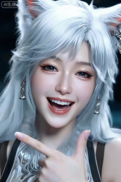 这是CGI动漫风格的图,国漫角色,她的名字叫银月,一个长着飘逸的白色长发和尖耳朵的人物,看起来像狐狸。这个角色被复杂的银色配饰装饰着,包括耳环和带有小装饰元素的头饰。衣服、眼睛的光泽以及全身的皮肤纹理都清晰可辨,脸部细节极其丰富,皮肤白暂光泽,冷白光感,超高细节精度。捧腹大笑,近照,手指指着。柔焦美学,情绪写意,前卫视觉艺术美学,大片高级感,电影美学,大师杰作.