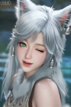 这是CGI动漫风格的图,国漫角色,她的名字叫银月,一个长着飘逸的白色长发和尖耳朵的人物,看起来像狐狸。这个角色被复杂的银色配饰装饰着,包括耳环和带有小装饰元素的头饰。这是一张高度详细的CGI 图像,显示的是一位有着动漫风格外观的年轻女性。她有一头蓬松的银白色长发,狐狸般的耳朵上戴着小银铃。她的眼睛很大,呈绿色,表情丰富,一只眼睛顽皮地眨着眼睛。她的皮肤光滑白皙,脸颊上还带着淡淡的红晕。她穿着一件毛皮镶边的衣服,从画面底部可见。背景模糊,混合了蓝色和绿色色调,暗示着自然的户外水景。整体风格写实,但又保留了高品质数字动漫艺术典型的柔和、空灵的品质。。柔焦美学,情绪写意,前卫视觉艺术美学,大片高级感,电影美学,大师杰作.