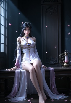 masterpiece,best quality,amazing quality,very aesthetic,high resolution,ultra-detailed,absurdres,scenery,photorealistic,(looking at viewer:1.1),(Dark room:1.3),(moody lighting:1.1),peach blossom,falling petals,(large breasts:0.8),monvzhenshen,1girl,solo,black hair,long hair,jewelry,dress,white dress,hair ornament,blue eyes,detached sleeves,bare shoulders,gem,realistic,necklace,braid,barefoot,sitting BREAK photorealistic details,<lora:QQSillmonvzhenshenV1:0.8>,