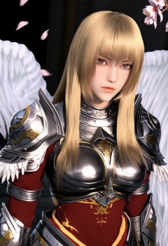masterpiece,best quality,amazing quality,very aesthetic,high resolution,ultra-detailed,absurdres,scenery,photorealistic,(looking at viewer:1.1),(upper body:1.2),(Dark room:1.3),(moody lighting:1.1),peach blossom,falling petals,(large breasts:0.8),tianshiyan,1girl,blonde hair,solo,long hair,armor,shoulder armor,lips,angel wings,brown eyes,breastplate,realistic,skirt,boots,close-up,portrait BREAK photorealistic details,<lora:QQSilltianshiyanV1>,