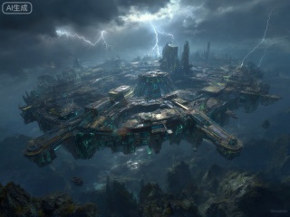 An awe-inspiring, colossal floating city-state, constructed from iridescent, weathered metal and bioluminescent crystalline structures, drifting silently through a dense, perpetual electric storm cloud layer over an endless, petrified alien jungle. The primary light source is the intermittent, violent flashes of lightning revealing vast, cathedral-like docking bays and intricate, fractal pathways connecting the different city sectors. Low-altitude anti-gravity vessels navigate the chaotic air currents. Emphasize the sense of scale, danger, and solitary grandeur.