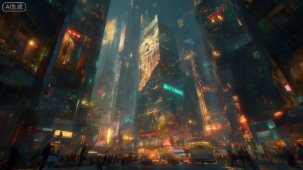 A vibrant geometric cityscape at night, with towering skyscrapers adorned with intricate geometric patterns, neon lights reflecting off glass facades, and bustling streets filled with people. The composition captures a wide-angle view, showcasing the city's grandeur, with a central focus on a bustling intersection. The lighting is dynamic, with warm neon hues contrasting against cool shadows, creating a futuristic atmosphere. The scene is alive with movement, featuring pedestrians, cars, and public transport, all framed against the backdrop of a glowing, geometric metropolis.