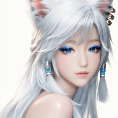 masterpiece,high quality,tall,game cg,highres,(soft light:1.2),white_skin,(shiny_skin:0.6),(realistic:1.1),glitter,<lora:银月·衣服百搭款·化妆:0.7>,yinyue,solo,animal ears,blue eyes,1girl,eyelashes,white background,white hair,looking at viewer,earrings,simple background,long hair,jewelry,fox_ears,makeup,lips,eyeshadow,hair tubes,closed mouth,upper_body,bare shoulders,