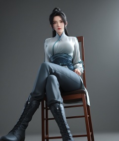 (score_9),masterpiece,best quality,absurdres,highres,BREAKwhite_skin,(fair_skin:1.1),<lora:宁姚-ill:0.85>,ningyao,1girl,solo,long hair,black hair,ponytail,jewelry,earrings,brown eyes,light blush,chinese clothes,sash,boots,lace-up boots,pants, collarbone,(large breasts),puffy chest,looking at viewer,sitting,crossed legs,pov,from below,chair,BREAKsimple background,Tyndall effect,Cinematic Lighting,Volumetric Lighting,