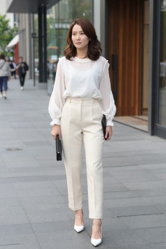 A photograph of an Asian woman with medium-length, wavy brown hair, standing on a city sidewalk. She is wearing a sheer, white blouse with ruffled sleeves, high-waisted, cream-colored trousers, and white pointed-toe heels. She holds a black clutch in her left hand. The background shows a modern urban setting with glass windows, a wooden door, and a few pedestrians walking in the distance. The lighting is natural, indicating daytime.