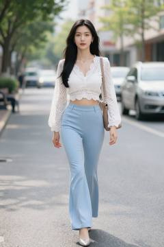 A young woman, mid-20s, with long, straight black hair, gazes directly at the viewer while strolling along a city street. She wears a white, long-sleeved, lace-detailed crop top that accentuates her figure. Pale blue, slightly flared pants, cinched at the waist, complement the top. A light brown leather purse hangs over her shoulder. Her expression is serene, with a slight smile. The woman's hands are posed casually. She wears sparkling silver heels. The background shows a sunny day with cars and buildings. The lighting is bright and even. The street's asphalt provides the foreground's texture, complemented by blurred greenery from the trees bordering the street. The composition centers on the woman, creating a sense of focus. The overall style is modern and fashionable. The mood is relaxed, capturing a sense of everyday elegance. The image suggests a soft, summery atmosphere. The image is taken from a medium distance, focusing on the woman.