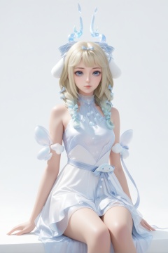masterpiece,best quality,realistic,cinematic,detail eyes,(ultra-detailed),perfect composition,intricate details,absurdres,detailed face,high quality,high res,8K,<lora:X_yao_dog_IL3.2:0.8>,blonde hair,blue eyes,1girl,long hair,breast,medium breast,hair_ornament,dress,sitting,simple background,white_background,