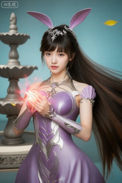 描绘的是一位年轻的亚洲女性,皮肤白皙,长发为深棕色,扎着高马尾辫,顶部有紫色兔耳。她五官精致,穿着一件精致的紫色和银色奇幻风格连衣裙,上面有复杂的漩涡图案。她手里拿着一朵发光的粉红色花朵,花瓣在她周围漂浮。她的连衣裙采用蓬松短袖和高领设计,并饰有银色配饰。她戴着一顶中央饰有银色头饰的头饰。背景是柔和的蓝绿色,有模糊华丽的喷泉和飘落的树叶。。,小舞