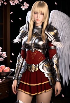 masterpiece,best quality,amazing quality,very aesthetic,high resolution,ultra-detailed,absurdres,scenery,photorealistic,(looking at viewer:1.1),(upper body:1.2),(Dark room:1.3),(moody lighting:1.1),peach blossom,falling petals,(large breasts:0.8),tianshiyan,1girl,blonde hair,solo,long hair,armor,shoulder armor,lips,angel wings,brown eyes,breastplate,realistic,skirt,boots,close-up,portrait BREAK photorealistic details,<lora:QQSilltianshiyanV1:0.8>,