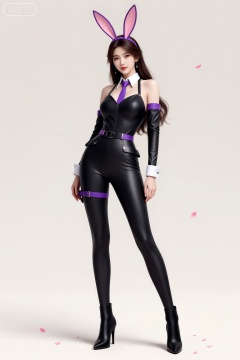 这是一幅精美的数字艺术作品,描绘了一位身穿黑色紧身皮革服装的女性角色。她站在一个浅色的背景前,周围散落着一些粉红色的花瓣。她的服装设计独特,带有紫色装饰和金属扣带,显得非常时尚和未来感。她的耳朵上戴着粉色的兔耳装饰,增添了一丝俏皮感。她穿着一双高跟短靴,整体造型优雅且具有力量感。她的头发是深色的,披散在肩上,与她的服装颜色相呼应。整个画面给人一种神秘而充满活力的感觉,角色的姿态自信且充满自信。
