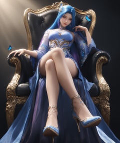 masterpiece,best quality,absurdres,highres,BREAK(glamor:1.1),slender,1girl,solo,<lora:唐舞桐-ill:0.83>,long hair,blue hair,hair ornament,gradient hair,jewelry,earrings,necklace,high collar,clothing cutout,dress,detached sleeves,anklet,high heels,butterfly,butterfly hair ornament,looking at viewer,front view,sitting,pov,from below,crossed legs,chair,(foot focus), BREAKsimple background,black background,rim light,Tyndall effect,Volumetric Lighting,Cinematic Lighting,realistic,depth of field,