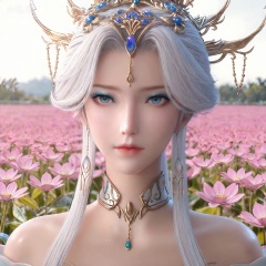 masterpiece,high quality,tall,game cg,highres,(soft light:1.2),white_skin,(shiny_skin:0.6),(realistic:1.1),,lvjing,,nangongxianyin,1girl,solo,jewelry,earrings,white hair,hair ornament,blue eyes,portrait,bare shoulders,closed mouth,makeup,long hair,looking at viewer,white_background,simple background,flower field,flower,day,
