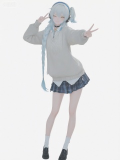 masterpiece,best quality,amazing quality,newest,absurdres,highres,very awa,professional,traditional media,buling,buling\(wuthering waves\),solo,1girl,full_body,primary view,loli,wide shot,rim lighting,side lighting,very long braided_ponytail,one_side_up,metal_headphones,blue hair,emotionless,official_art,cute,standing,golden eyes,light grey cotton sweater,white collared shirt,blue and white plaid skirt, white ankle socks,  black loafers,talismans_hairtie,tsunderia,blushing,loli,simple_background,white background,hand up, point forward,:3,blurred,idol,yuukkan,wink,choker,looking_at_viewer,eyes_open,v,clench hand,