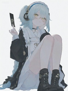 masterpiece,best quality,amazing quality,newest,absurdres,highres,very awa,buling,buling\(wuthering waves\),solo,1girl,full_body,loli,chibi,stickers,rim lighting,side lighting,very long braided_ponytail,one_side_up,metal_headphones,blue hair,emotionless,official_art,cute,sitting,holding black talismans,golden eyes,metal round glasses,talismans on leg, black ankle boots, maid dress,ribbon,tsunderia,blushing,loli,simple_background,white background,hand up, point forward,:<,choker,