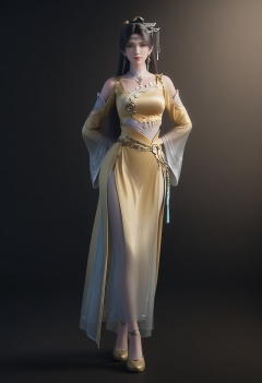 masterpiece,best quality,absurdres,highres,BREAK(glamor:1.1),slender,1girl,solo,<lora:金瓶儿-ill:0.82>,jingpinger,long hair,black hair,hair ornament,earrings,jewelry,green eyes,shoulder cutout,wide sleeves,yellow dress,see-through,anklet,shoes,looking at viewer,front view,standing,arms behind back,BREAKsimple background,black background,rim light,Tyndall effect,Volumetric Lighting,Cinematic Lighting,realistic,depth of field,