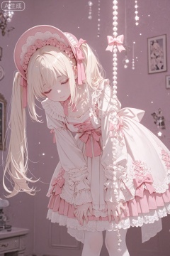 A two-dimensional style, a light pink Lolita girl, with long light blond hair, double ponytails hanging down, pink bows in her hair, and a Lolita hat of the same color on her head, with delicate pleats on the edge of the hat. Wearing a light pink Lolita dress with white lace and a pink bow at the neckline. The eyes show a hazy light tone, and the facial style is pale and delicate in a Gothic style. The picture is dotted with tiny stars, creating a dreamy and sweet atmosphere. Soft light, high details, high resolution, low saturation, illustration