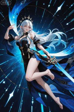 Fleurdelys \(wuthering waves\), clothes: Fleurdelys sexy style clothes, large blue levitating spiked circlet, Fleurdelys white and black dress, forehead mark with forehead horn, blue long detached train clothes, 1girl, long hair, pointy ears, barefoot, jewelry, mature female, line art,line style,