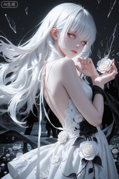 masterpiece,absurdres,best quality,high quality,chromatic_aberration,Night,darkness,black theme, //, 1girl, solo, long hair, dress, looking at viewer, grey eyes, white eyes, glass, white dress, white hair, flower, closed mouth, broken glass, white theme, bare shoulders, white flower, glass shards, water, dress flower, reaching, reaching towards viewer, watermark, sleeveless, reflection, white rose, expressionless, sleeveless dress, standing, blunt bangs, crack, cowboy shot, grey theme, breaking, rose, shards, hands up, backless outfit, artist name, fingernails, upper body, shawl, eyelashes //, (monochrome:1.2),(silhouette:1.2),oil painting \(medium\),brushstroke,taitai,(maccha (mochancc):0.6),(suzumi (ccroquette):0.7),(wlop:0.6),(reoen:0.6),(tianliang duohe fangdongye:0.7),(rhasta:0.6),very awa,very aesthetic,extreme aesthetic, //, highres,HDR,8K,high contrast,illustration,depth of field,(colorful),Tyndall effect,contrast,lens flare,