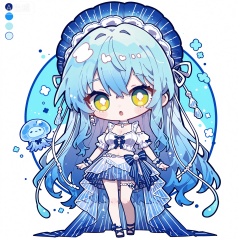 1girl, solo, ice blue jellyfish-like hair, transparent wavy hair, bioluminescent hair tips, light amber jellyfish eyes, glowing pupils, innocent expression, soft gaze, slightly open mouth, pale translucent skin, bioluminescent blue blush, jellyfish humanoid, full body jellyfish transformation, jellyfish tentacle limbs, transparent tentacles with bioluminescent blue stripes, floating tentacles, jellyfish bell-shaped skirt, sheer bioluminescent blue overlay, white camisole, light blue lace trim, ice blue cropped blouse, puff sleeves, white bow, white pearl choker, light blue ribbon wristbands, standing pose, floating posture, ethereal movement, solid white background, no other background elements, bioluminescent glow, transparent texture, delicate line art, soft shading, no watermark, no text, marine fantasy, pure and ethereal aesthetic,border,round border.,chibi