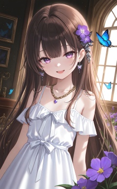 masterpiece,very aware,highres,absurdres,newest,best quality,petite,high quality,chromatic_aberration,cinematic_angle,dutch angle,child,petite,//,1girl,solo,long hair,looking at viewer,smile,open mouth,bangs,brown hair,black hair,hair ornament,dress,bow,jewelry,very long hair,purple eyes,upper body,flower,earrings,indoors,hair flower,necklace,white dress,window,chain,bug,butterfly,purple flower,<lora:12.17lczz new:0.8>