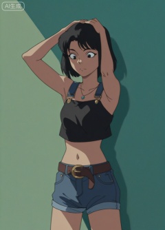 A young woman is depicted in a dynamic pose,standing against a textured green wall. She has her head tilted upwards,suggesting a moment of reflection or appreciation. Her dark,tousled hair adds to her casual and relaxed appearance. She is wearing a sleeveless top that reveals her midriff and distressed denim shorts,along with a simple necklace and a belt. The overall composition emphasizes her figure and the contrast between her dark clothing and the vibrant green wall.,