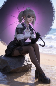Nai3 style,realistic style photo,outstanding style,Use soft lighting to cast gentle shadows on the subject,adding a touch of dimension to your images without compromising details,whirls of vapor,(Anime:1.1),soft neon light,ethereal ambiance,delicate details,magical atmosphere,concept art,highly detailed,ultra-high resolution,32K UHD,sharp focus,best-quality,masterpiece,golden hour,unconventional supreme masterpiece,masterful details,temperate atmosphere,with a high-end texture,in the style of fashion photography,magazine style,Dynamic Angle,Dynamic posture,magazine style,Dynamic Angle,Dynamic posture,(cowboy_shot:1.2),eye trail,depth of field,cinematic lighting,lens flare,close-up,extreme aesthetic,(wlop:0.6),(honjou raita,lack,rella,wanke:0.5),masterpiece,best quality,good quality,newest,year 2025,very aesthetic,absurdres,Visual impact,A shot with tension,ultra-high resolution,32K UHD,sharp focus,best-quality,masterpiece,Emotionalization,unconventional supreme masterpiece,masterful details,temperate atmosphere,with a high-end texture,in the style of fashion photography,(Visual impact:1.2),giving the poster a dynamic and visually striking appearance, <lora:CF-关小羽v2-IL:0.7> 1girl, twintails, grey hair, drill hair,crown, brown eyes, eyepatch, black gloves, elbow gloves,white shirt,bow,black skirt, black pantyhose, thigh strap, holster,black footwear, sitting,rock,Seaside,beach,waves,full body,holding umbrella